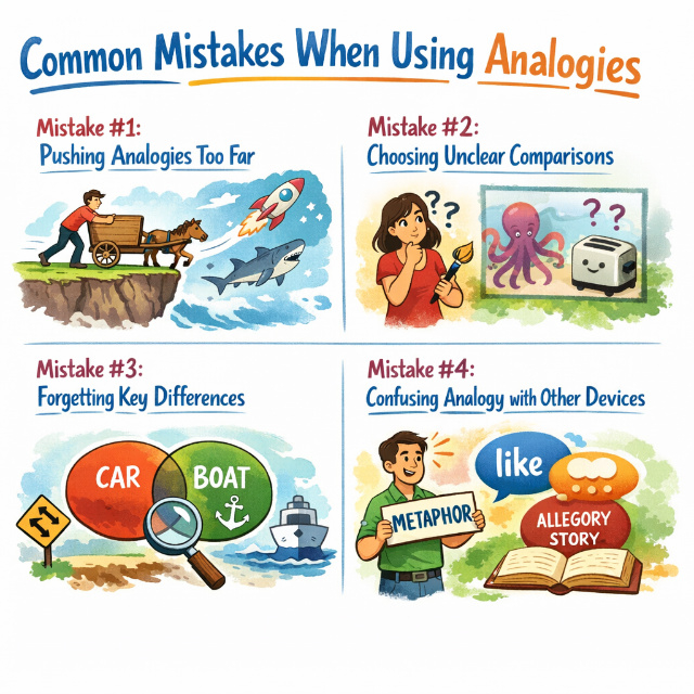 | The key difference: Analogies develop the comparison systematically to explain or clarify, not just create imagery. |