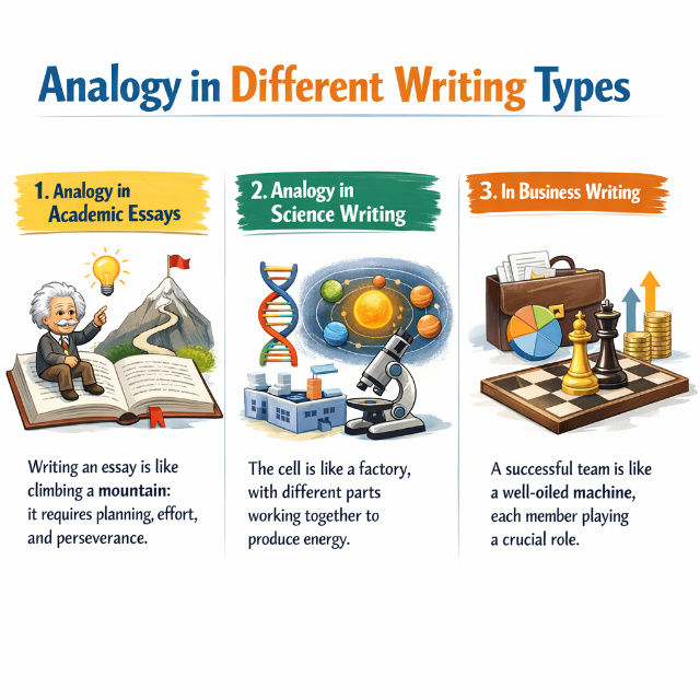 The quick test: If the comparison explains how two things work similarly in multiple ways, it's an analogy. Example: "A cell is like a factory. The nucleus is the control center, mitochondria are power plants, ribosomes are assembly lines, and the cell membrane is the security gate." |