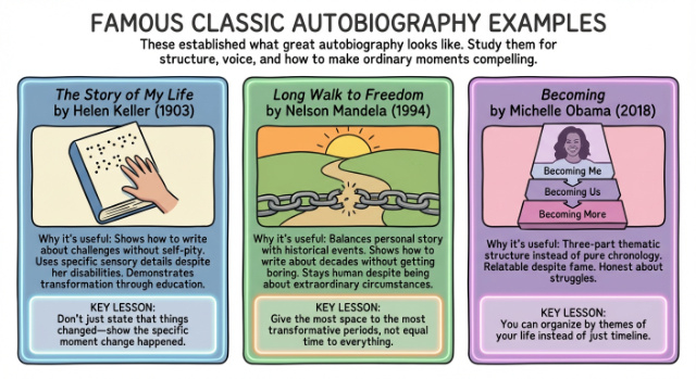 Many examples blur the lines between these related forms. Understanding autobiography vs memoir helps you analyze examples more effectively.