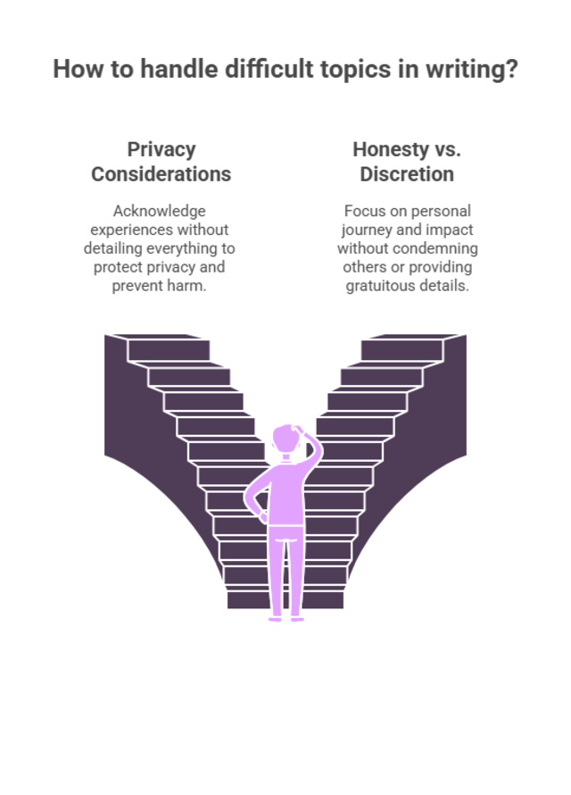 Honesty vs. Discretion: Strive for honesty about your experiences and feelings without gratuitous detail or score-settling. Focus on your journey rather than condemning others. You can write about the impact of others' actions on you without extensively chronicling their flaws or mistakes.