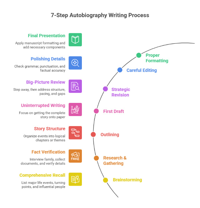 Writing an autobiography involves a systematic seven-step process: brainstorming significant life events and influential people, researching and gathering supporting materials like photos and documents, creating a detailed outline that organizes your experiences logically, writing a first draft in chronological or thematic order using first-person perspective, revising to add depth and improve narrative flow, editing for grammar and factual accuracy, and finally formatting your manuscript according to standard conventions.