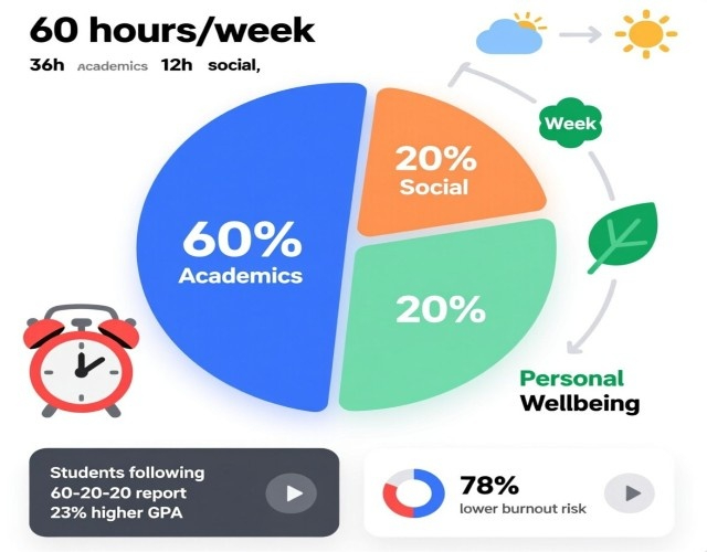 A sustainable weekly framework allocates approximately 60% of time beyond basic needs to academics, 20% to social connection, and 20% to personal wellbeing, including exercise, hobbies, and solitude. For a student with 60 hours weekly beyond sleep, meals, and basic care, this means 36 hours for academics, 12 hours for socializing, and 12 hours for self-care.