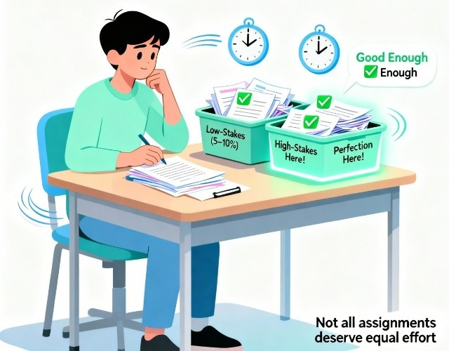 Not all assignments deserve equal effort. Identify low-stakes assignments worth 5 to 10% of grades where "good enough" suffices while perfect performance provides minimal grade benefit. Do these assignments competently but quickly, reserving perfectionist effort for high-stakes work. Research shows that students who strategically differentiate effort by assignment stakes achieve 0.2 to 0.3 point higher GPAs than those who treat everything equally by avoiding wasted effort on minimal-impact work.