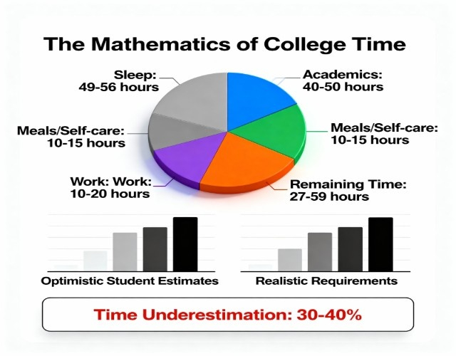 Studies on time allocation show college students average 42 to 48 hours weekly on academics, including classes, studying, and assignments, leaving 40 to 45 hours for sleep, meals, self-care, work, and socializing, barely enough for everything when calculated realistically rather than optimistically.