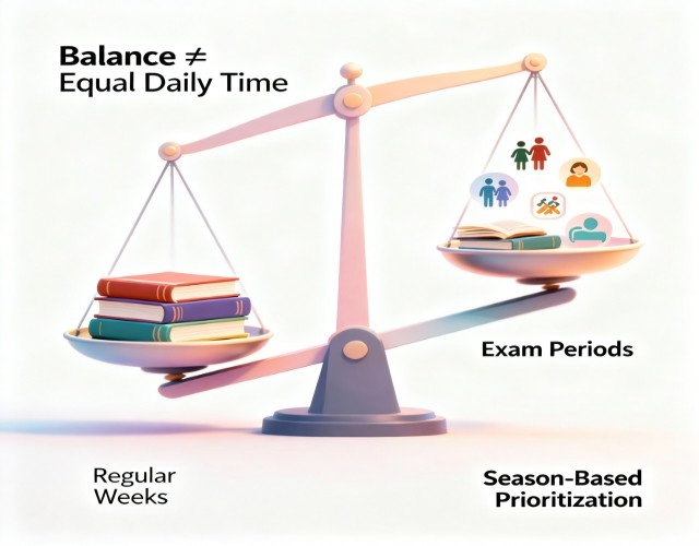 Balance doesn't mean equal daily time distribution. Academic calendars create natural high and low-pressure periods. Regular weeks allow balanced engagement while exam periods require temporary academic focus. Research shows that students who intensively prioritize academics during 3-4 week high-stakes periods and then relax standards during lower-stakes weeks, achieve similar or better GPAs than those maintaining constant high effort while experiencing 30 to 40% less burnout.