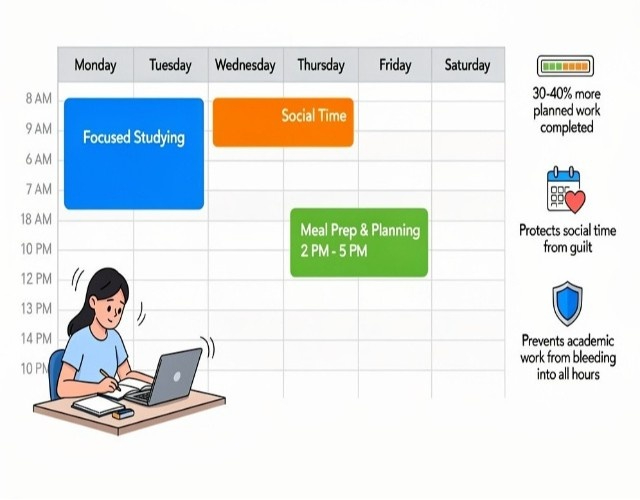Time-blocking involves assigning specific hours to specific activities, creating a visual structure for your week. Block 9 AM to 12 PM Monday, Wednesday, Friday for focused studying. Block Tuesday and Thursday evenings for social time. Block Sunday afternoons for meal prep and planning. Research shows that students using time-blocking complete 30 to 40% more planned work compared to those using to-do lists without scheduled times. The visual structure prevents academic work from bleeding into all available hours while protecting social time from guilt.
