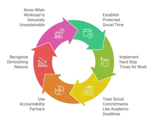 - Prevent one area from consuming everything through firm boundaries like designated no-study times, hard stop times for work, treating social commitments seriously as academic deadlines, and recognizing diminishing returns of perfectionism.