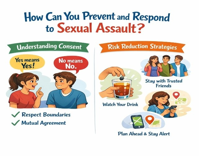 Know prevention and response for sexual assault, understanding consent basics (enthusiastic, ongoing, freely given), recognizing that 82% of campus assaults involve acquaintances, not strangers, maintaining moderate alcohol consumption, preserving judgment, and knowing campus resources, including the Title IX office, counseling center, and 24/7 crisis hotlines.