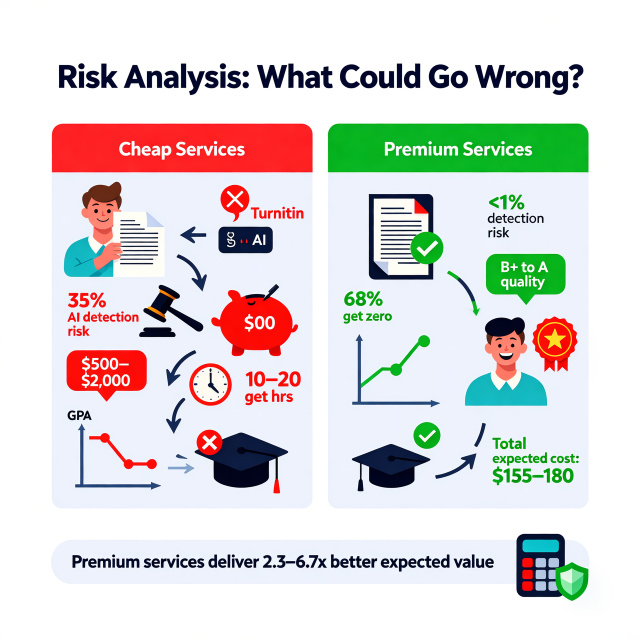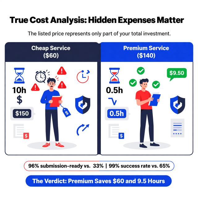 The $80 price difference between cheap and premium services appears significant initially but represents poor economy when hidden costs emerge. Cheap services force you to become an editor, researcher, and quality controller—roles that consume hours and still leave academic risks.