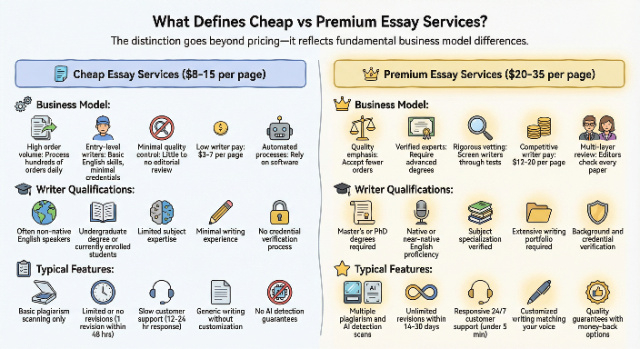 The comparison between cheap and premium essay services reveals clear cost-benefit differences.