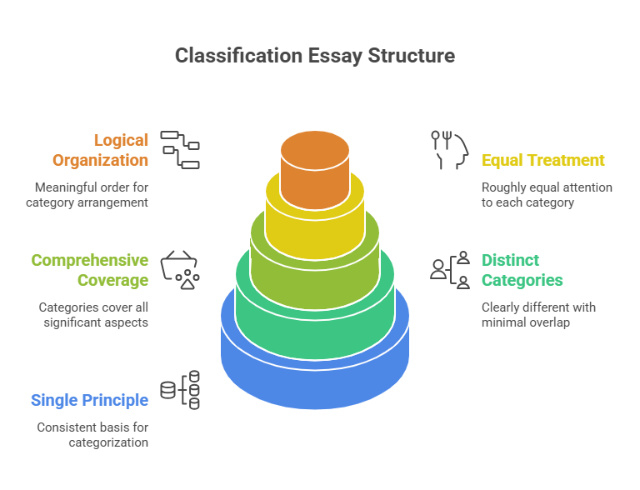 Single Organizing Principle: Every classification essay uses one consistent basis for categorization. Mixing principles (categorizing movies by both genre AND budget in the same essay) creates confusion and weakens your analysis.