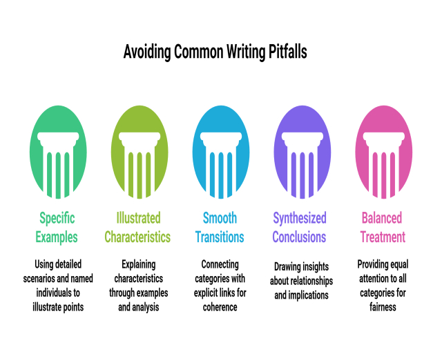 For each category in your essay, develop 2-4 examples with this level of specificity. Include names (real or hypothetical), concrete behaviors, specific numbers, timelines, or sensory details that bring categories to life. The time invested in detailed example development pays off in essay quality and reader engagement.