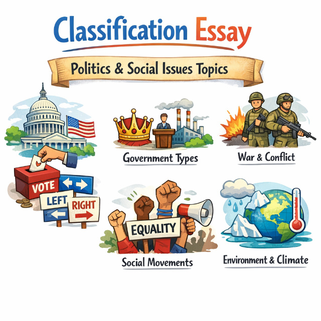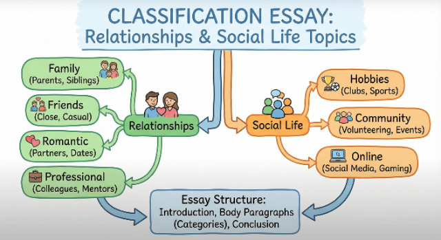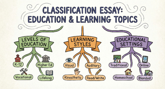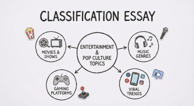 Pick topics allowing 3-6 distinct categories with concrete examples you can access through observation or research educational topics work for academic audiences while social media and lifestyle topics engage general readers. Browse categories above, test your chosen topic by listing potential categories and examples, then visit our classification essay guide for complete writing instructions including organizing principles and thesis formulas.