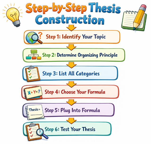 Copy one of three proven formulas: basic three-part for straightforward essays, advanced descriptive for sophisticated analysis, or significance-focused for research papers emphasizing implications. Ensure your thesis accomplishes three tasks: identifies the topic clearly, states the organizing principle explicitly, and names all categories in logical order.