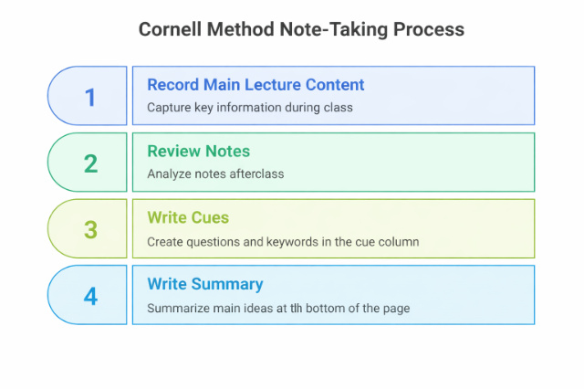 During lectures, focus on the notes column: capture information efficiently without worrying about the other sections. Immediately after class (within 24 hours), complete the cue column and summary section while material is fresh. This review process is where deep learning occurs.