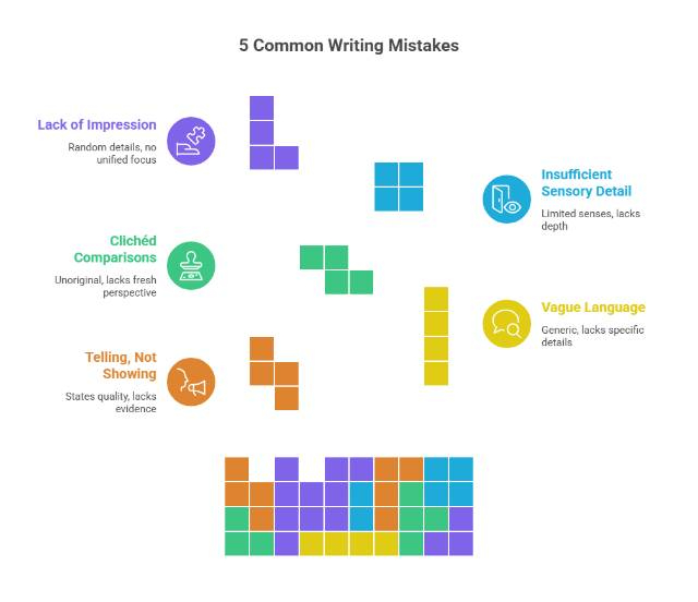 Fix: Establish a clear dominant impression in the thesis, select only details reinforcing it, and delete contradictory observations