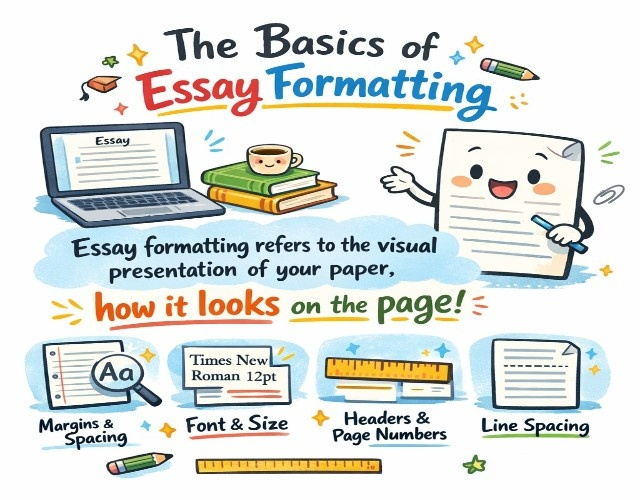 Essay formatting refers to the visual presentation of your paper, how it looks on the page. This includes page setup (margins, fonts, spacing), document structure (title, paragraphs, sections), and citation style (how you credit sources).