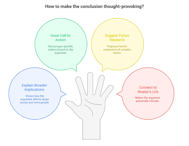 Make your conclusion thought-provoking by offering insights or demonstrating broader significance. This final element transforms adequate conclusions into memorable ones by answering the crucial question: "So what? Why does this matter?"