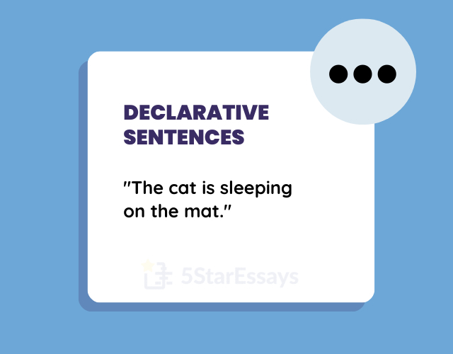 Declarative sentences make statements and present information. They're the workhorses of academic writing, probably 90% of your essay sentences fall into this category. These sentences use standard subject-verb-object word order and always end with a period.