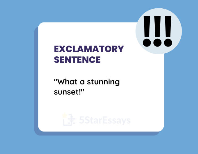 Exclamatory sentences express strong emotion, surprise, or emphasis and always end with an exclamation point. They can have the same structure as declarative sentences but with added emotional intensity.