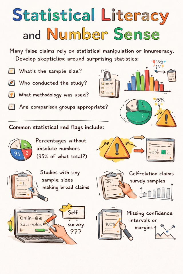 Many false claims rely on statistical manipulation or innumeracy. Develop skepticism around surprising statistics. Ask: What's the sample size? Who conducted the study? What methodology was used? Are comparison groups appropriate?