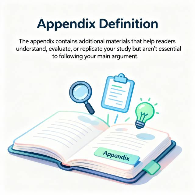An appendix is supplementary material placed at the end of your paper (after the reference list) that supports your research but would disrupt the flow of your main argument if included in the body text.
