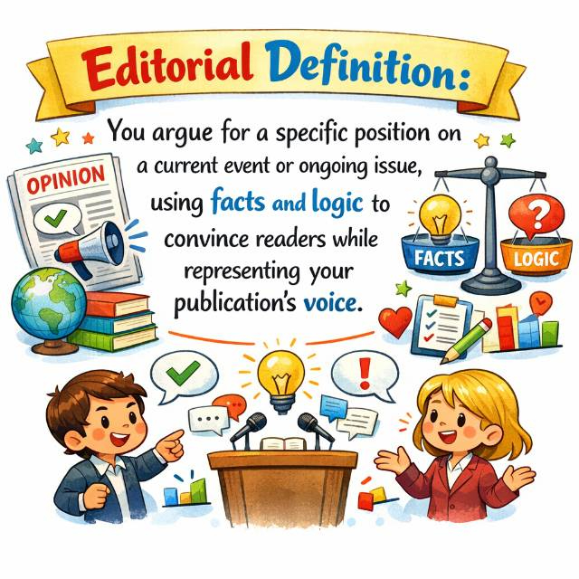 An editorial is an opinion piece published in a newspaper, magazine, or online publication that takes a clear stance on a timely issue and attempts to persuade readers to adopt that viewpoint or take specific action.