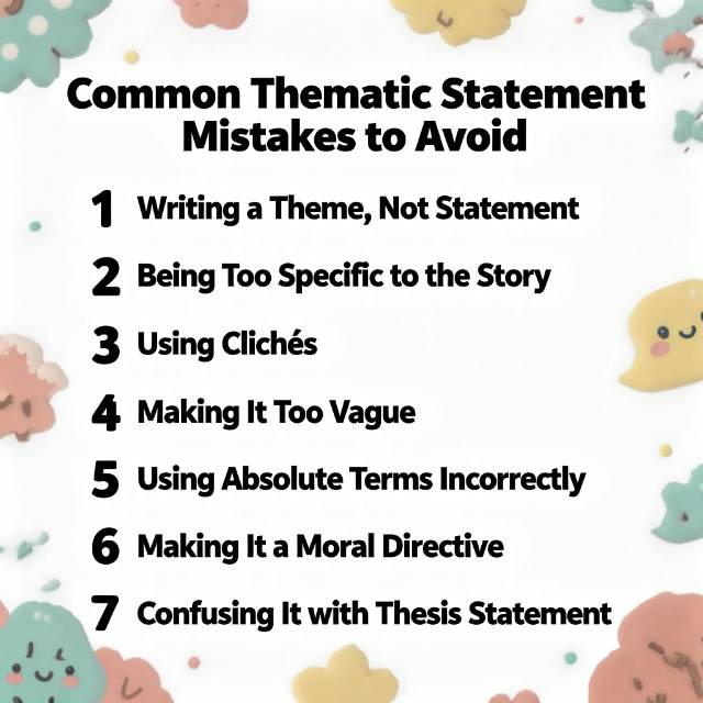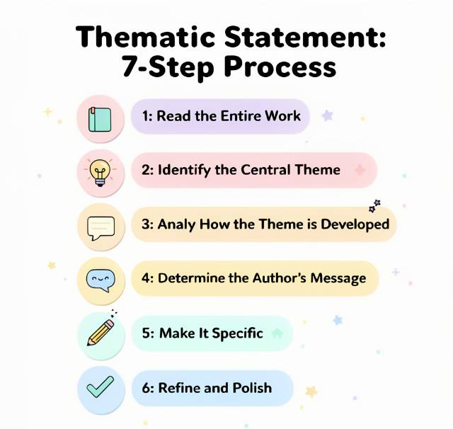 The key to mastering thematic statements? Practice. Every time you read, ask yourself: "What is this work saying about human nature, society, or life?" Turn that answer into a complete sentence, and you've got your thematic statement.