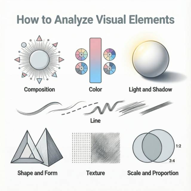 - Effective analysis is systematic, examining composition, color, light, line, shape, texture, and scale rather than making scattered observations.