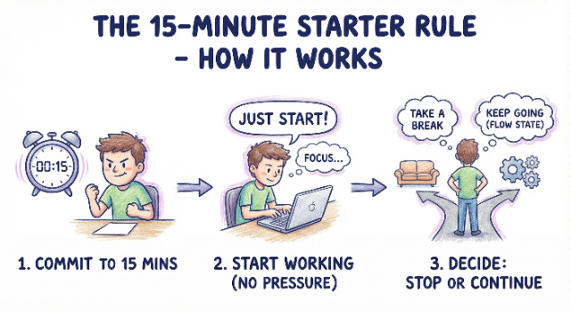 The starter rule works because it removes the overwhelming commitment to "finish the essay." You're not committing to 8 hours of work—just 15 minutes. Your brain can handle 15 minutes of anything.