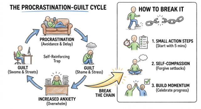 Guilt and self-criticism about procrastination create additional negative emotions that fuel more avoidance. Breaking this cycle requires self-compassion that acknowledges procrastination without judgment.