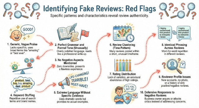 - Authentic reviews include 3-4 specific verifiable details—subject, timing, quality specifics, issues
