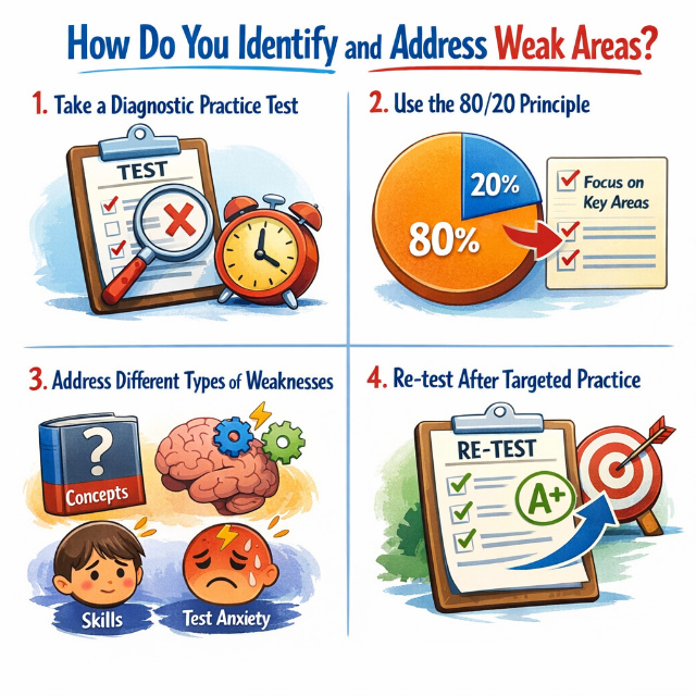 Strategic review focuses effort on actual weaknesses, not comfortable repetition of already-mastered material. Diagnostic assessment reveals where to concentrate your limited time.