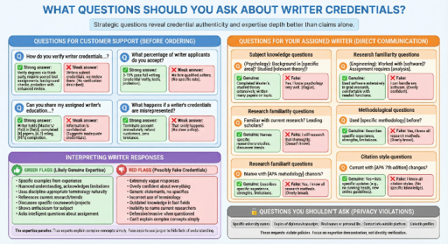 The credential verification challenge exists because privacy protections prevent sharing personal documents. However, combining platform verification trust with strategic testing (questions, test orders, performance metrics review) effectively confirms writer expertise. Quality services invest 15-25% of revenue in verification infrastructure during recruitment because credential accuracy protects their reputation.