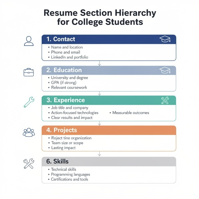College student resumes should include education (prominently placed), relevant coursework, academic and personal projects, any work experience emphasizing transferable skills, leadership roles and activities, technical skills, and optional sections for certifications, publications, or volunteer work depending on available space and relevance.