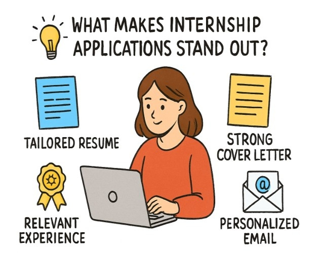 Winning internship applications combines tailored resumes highlighting relevant coursework and projects when experience is limited, customized cover letters directly addressing specific position requirements and company culture, and a professional online presence through LinkedIn profiles matching application materials.