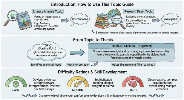 These topics are starting points, not complete thesis statements. A topic like "Light and dark imagery in Romeo and Juliet" identifies what you'll analyze but doesn't state your interpretation. Your thesis adds the "so what": "Shakespeare uses light and dark imagery to emphasize how the lovers' relationship exists in opposition to the violent feud, foreshadowing their tragic deaths." The topic identifies the analytical focus; the thesis makes the argument.