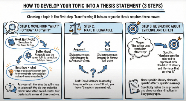 Choosing a topic is the first step. Transforming it into an arguable thesis requires three moves:
