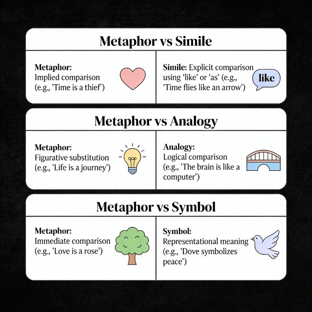 | Key difference: Symbols are objects representing abstract ideas. Metaphors are direct comparisons. |