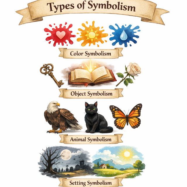 Symbolism uses objects, colors, characters, or events to represent abstract ideas beyond their literal meaning. The goal isn't just description, it's adding depth and thematic resonance.
