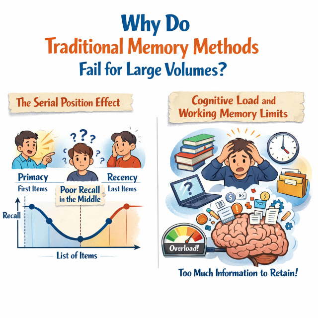 Research shows you naturally remember items at the beginning and end of lists (primacy and recency effects) but forget everything in the middle. For a 50-item list, you might remember items 1-3 and 48-50 while completely forgetting items 20-35. This is why reading long lists repeatedly produces such poor results; the middle vanishes no matter how many times you review.