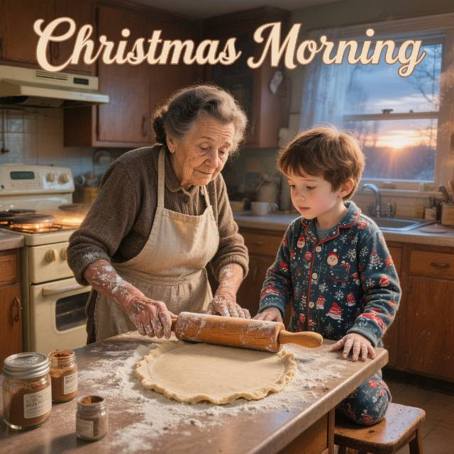 The dough felt smooth and cold under my palms. She'd taught me to roll from the center outward, turning the dough a quarter turn after each roll so it formed an even circle. The rolling pin was wooden, worn smooth from decades of use, and it left a faint coating of flour on everything: the counter, my hands, my pajamas.