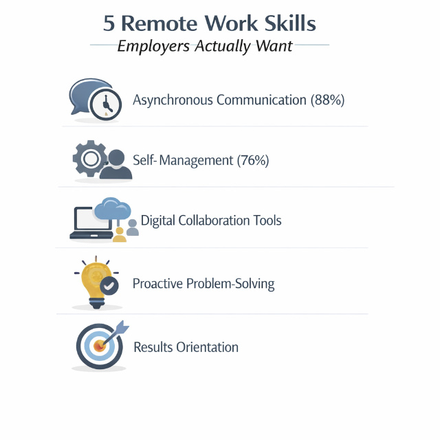 - Employers prioritize five core competencies: asynchronous communication (89% cite as top requirement), self-directed time management (76% cite as critical), digital collaboration tool proficiency, proactive problem-solving, and results orientation, measured by completed deliverables