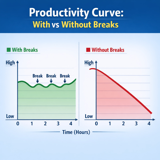 | Breaks | Random or skipped entirely | Scheduled short and long breaks |