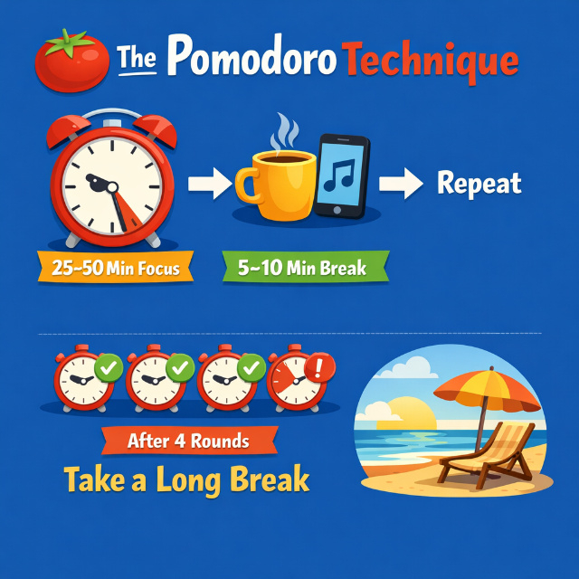 For longer attention spans, modify to 50-minute work blocks with 10-minute breaks. Experiment to find what maintains your peak focus. The key is predetermined work and break times, not flexible "I'll break when I feel like it" approaches.