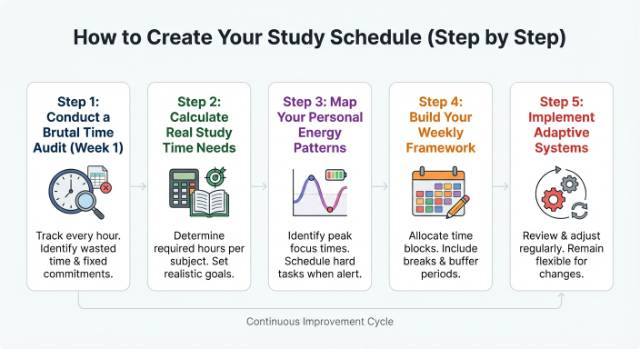 Build your study schedule in five distinct phases: audit your time, calculate study needs, map your energy patterns, assign study blocks strategically, and implement adaptive systems.