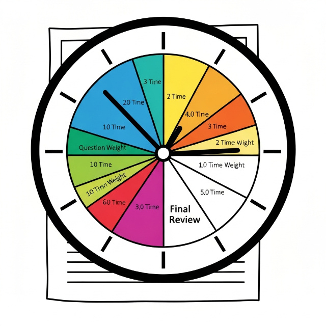 Allocate time proportional to point values, not question count. A 40-point essay deserves more time than ten 1-point multiple-choice questions worth 10 points total. Calculate rough minutes per point, then stick to your allocation.