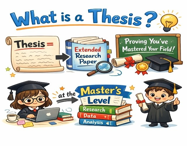 A thesis is a substantial research paper required for earning a master's degree, demonstrating your mastery of a subject through comprehensive research, analysis, and synthesis of existing knowledge.