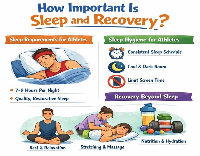 Sleep and recovery are critical for both athletic performance and academic success, with student athletes requiring 8-10 hours nightly (more than non-athletes' 7 to 9 hours) for physical recovery, cognitive function, and injury prevention.