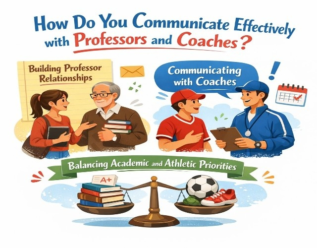 Communicate effectively by informing professors of athletic commitments and travel schedule first week of semester, providing game schedules showing potential conflicts upfront, asking professors during office hours about their policies on athlete absences and makeup work, similarly communicating academic demands (exams, major papers) to coaches enabling schedule flexibility when possible, advocating for yourself professionally explaining specific needs, and maintaining regular updates with both professors and coaches preventing surprises and building trust.